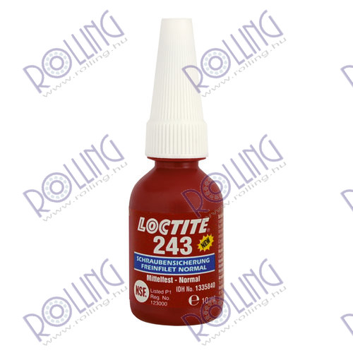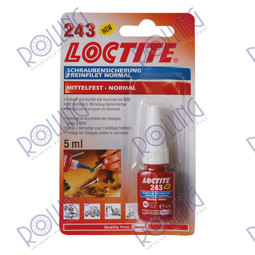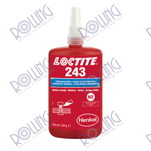 LOCTITE 243 is a medium strength blue threadlocking adhesive that seals and secures metal nuts and bolts to prevent loosening due to shock and vibration. LOCTITE® 243 is a general purpose threadlocker that provides a medium strength bond. LOCTITE 243 works on all metals, including passive substrates such as stainless steel, aluminum and plated surfaces. It is proven to be tolerant of minor contamination due to industrial oils, e.g., motor oils, corrosion prevention oils and cutting fluid.- Prevents loosening on vibrating assemblies, e.g. pumps, gear boxes or presses